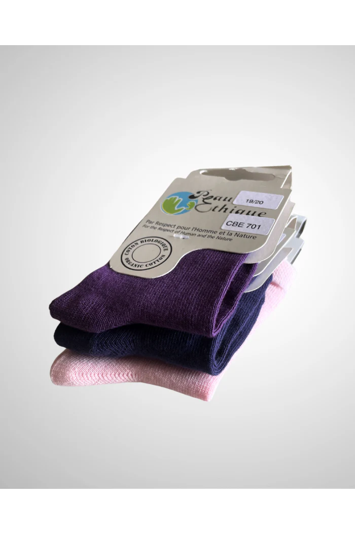 Lot de 3 paires de chaussettes en coton bio pour bébé : 1 violette, 1 bleu marine, 1 rose