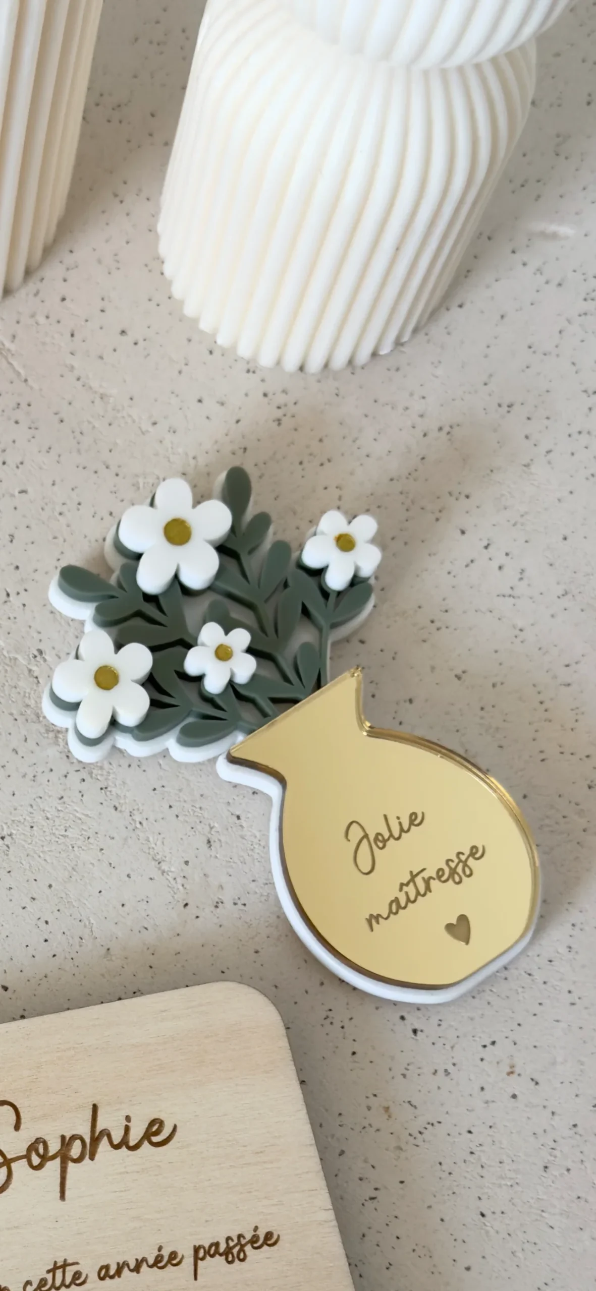 Aimant décoratif – Fleurs en relief Exprimez votre gratitude avec cet adorable aimant fleuri en acrylique, idéal pour remercier une personne précieuse à vos yeux : nounou, ATSEM, collègue, éducatrice ou proche. Avec ses jolies fleurs en relief et son vase doré effet miroir gravé du mot “Merci” ou toute autre inscription personnalisée, il apportera […]