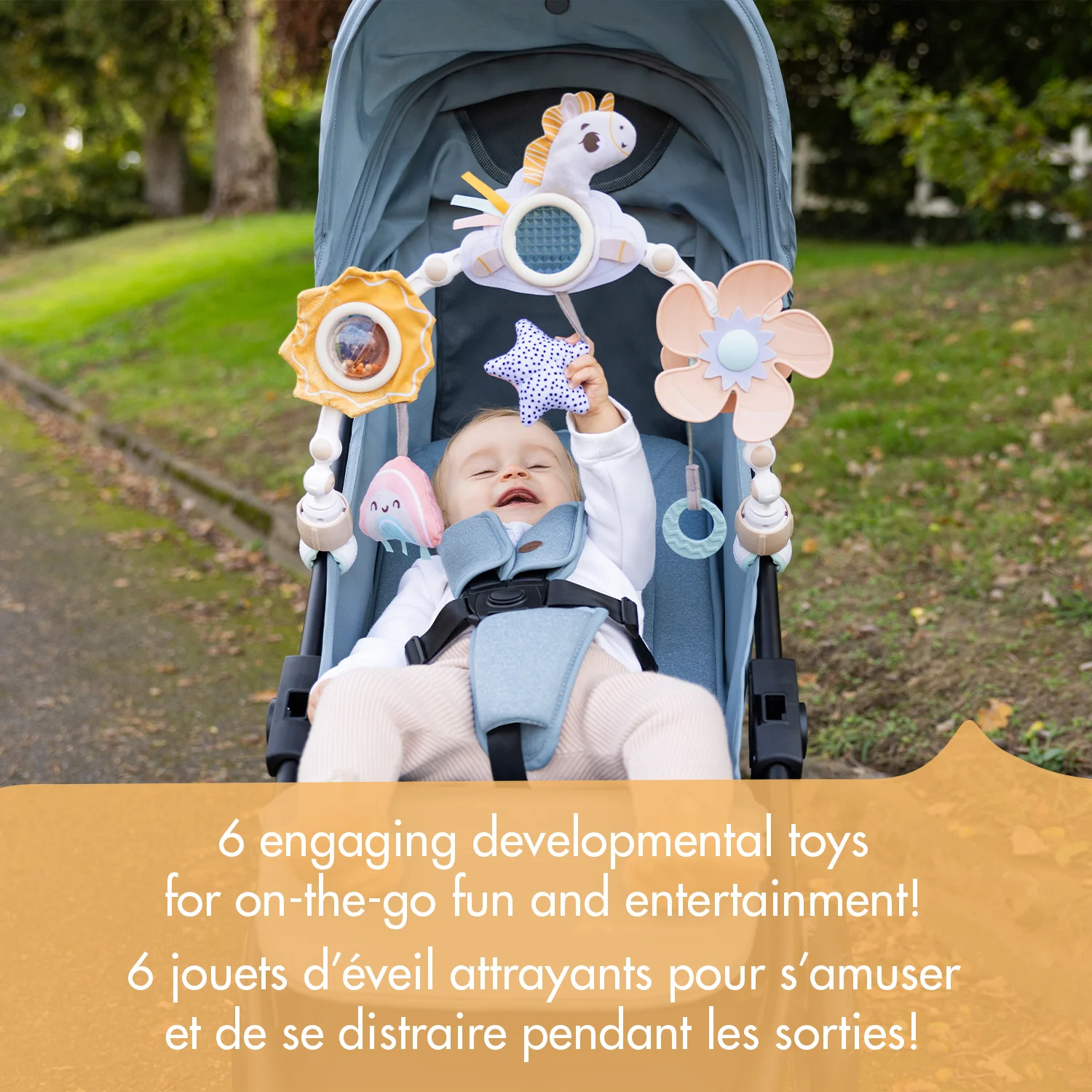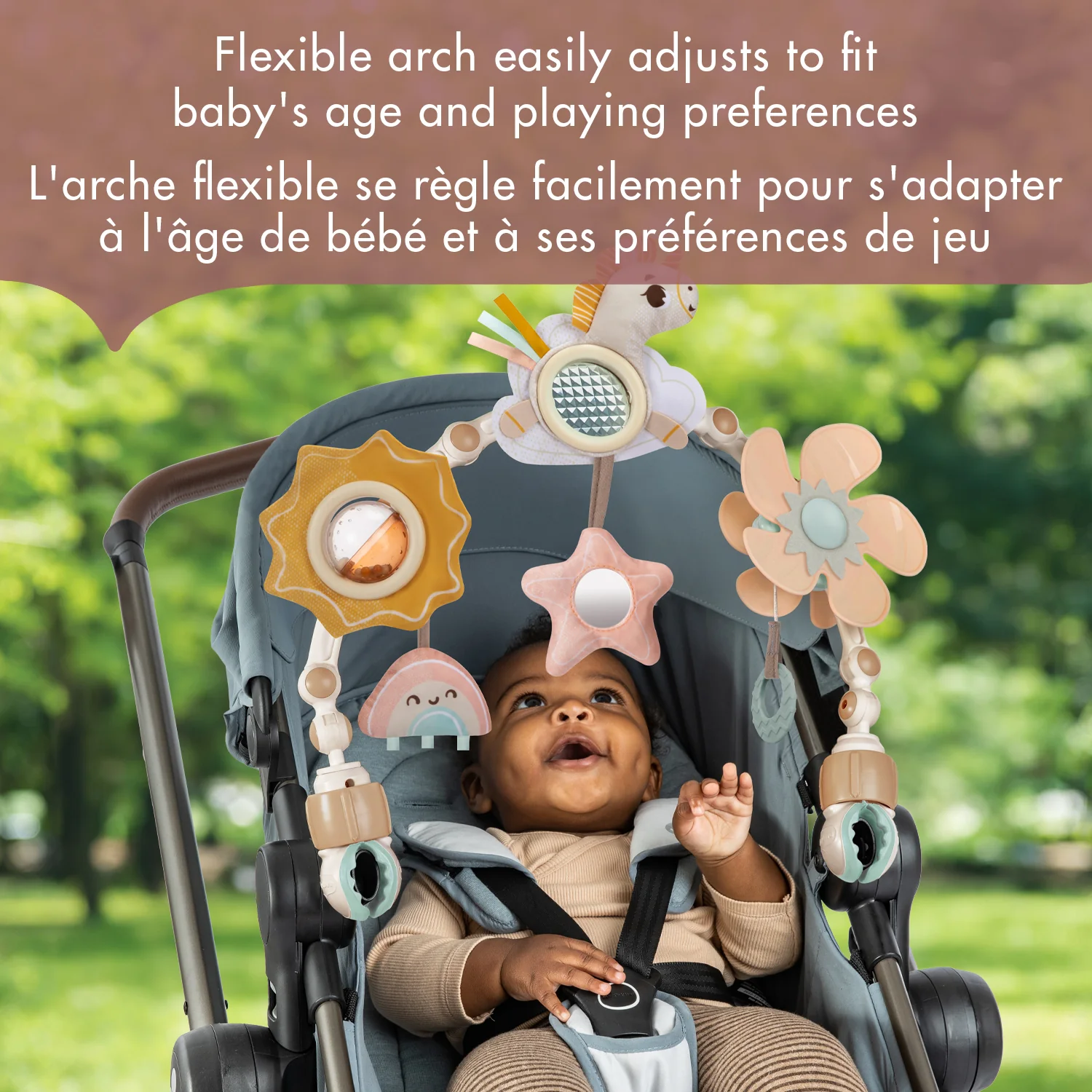 Adaptable à la plupart des poussettes, elle propose deux étapes de développement : l’exploration sensorielle à partir de 0 mois et l’apprentissage de la cause à effet à partir de 5 mois.