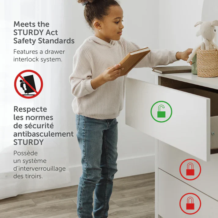 • NORMES DE SÉCURITÉ : le bien-être de votre famille nous tient à cœur. C’est pourquoi nos meubles de rangement pour les vêtements respectent les normes de sécurité en matière de basculement exigées par la loi STURDY (Stop Tip-overs of Unstable, Risky Dressers on Youth) et possèdent un système d’interverrouillage des tiroirs qui permet à une seule rangée de tiroirs de s’ouvrir à la fois.