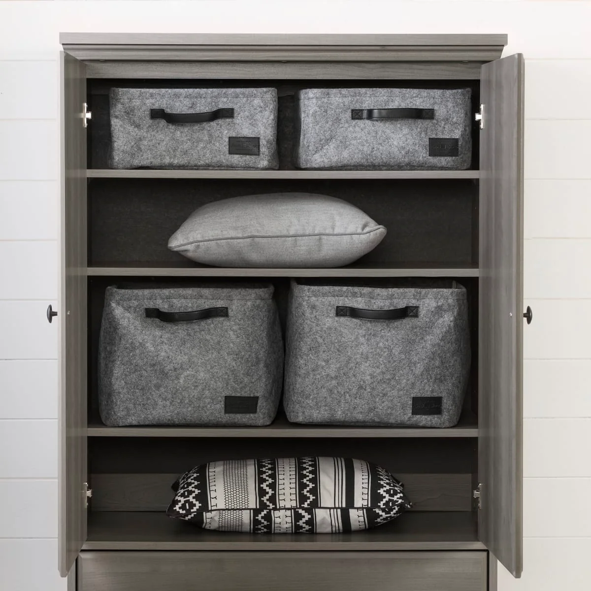 Avec ses quatre rangées derrière les portes d’armoire et ses deux tiroirs spacieux, ce meuble a une grande capacité de rangement. Vous pourrez maximiser chaque compartiment en ajustant la hauteur des trois tablettes et y glisser des paniers. Puisque tout sera hors de votre vue, ce sera le meuble idéal pour désencombrer vos garde-robes et vos bibliothèques. Des objets moins esthétiques tels que des draps, des jeux de société ou des dictionnaires pourront rester à portée de main sans gâcher votre décor. Chaque tablette supporte jusqu’à 25 lb. Vous serez surpris de tout ce qui s’y retrouvera!