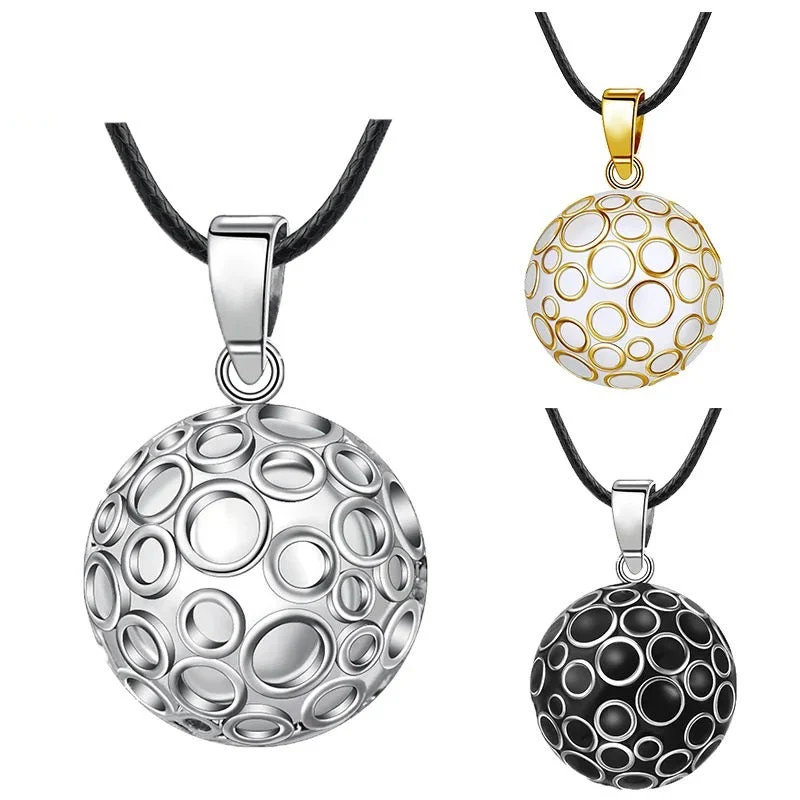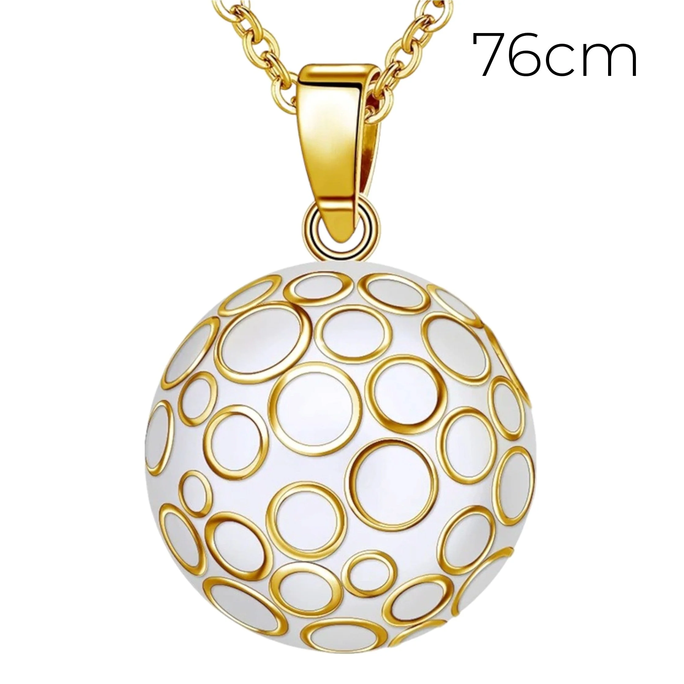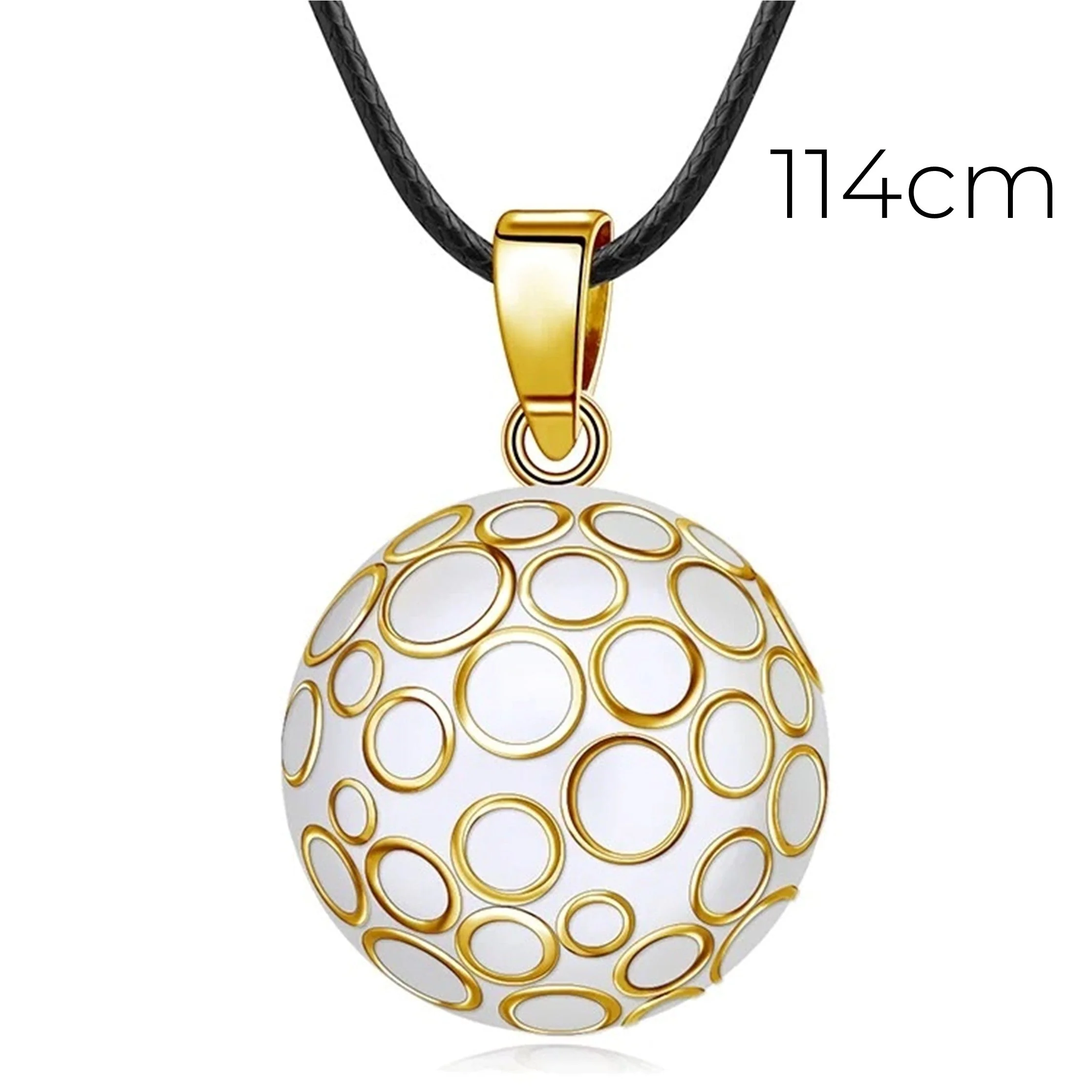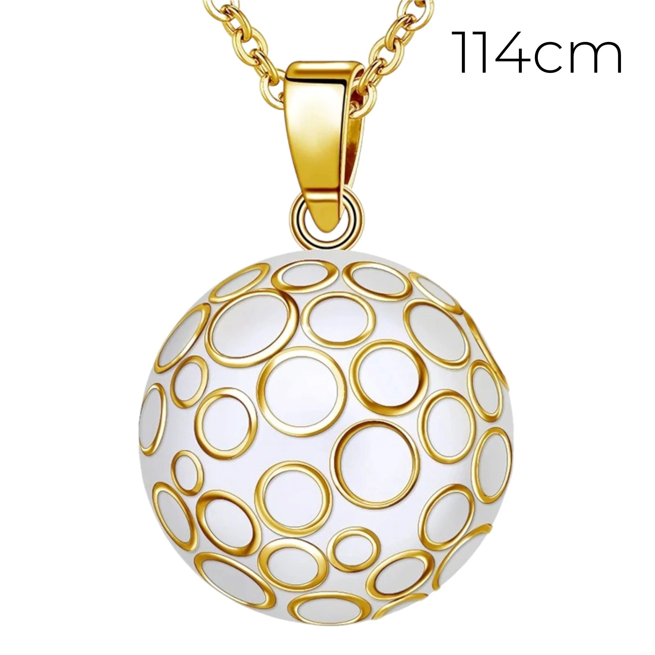 Notre bola blanc avec des cercles en or en relief est un bijou unique et élégant, qui apportera une touche de douceur et de raffinement à votre tenue. Chaque bola est fabriqué avec soin et émet un doux tintement apaisant, qui berce le bébé et favorise son développement sensoriel pendant la grossesse. Notre bola blanc et or a un diamètre de 22 mm et est disponible avec une chaîne en or de 2 longueurs au choix (76 cm ou 114 cm), pour s’adapter à toutes les morphologies.