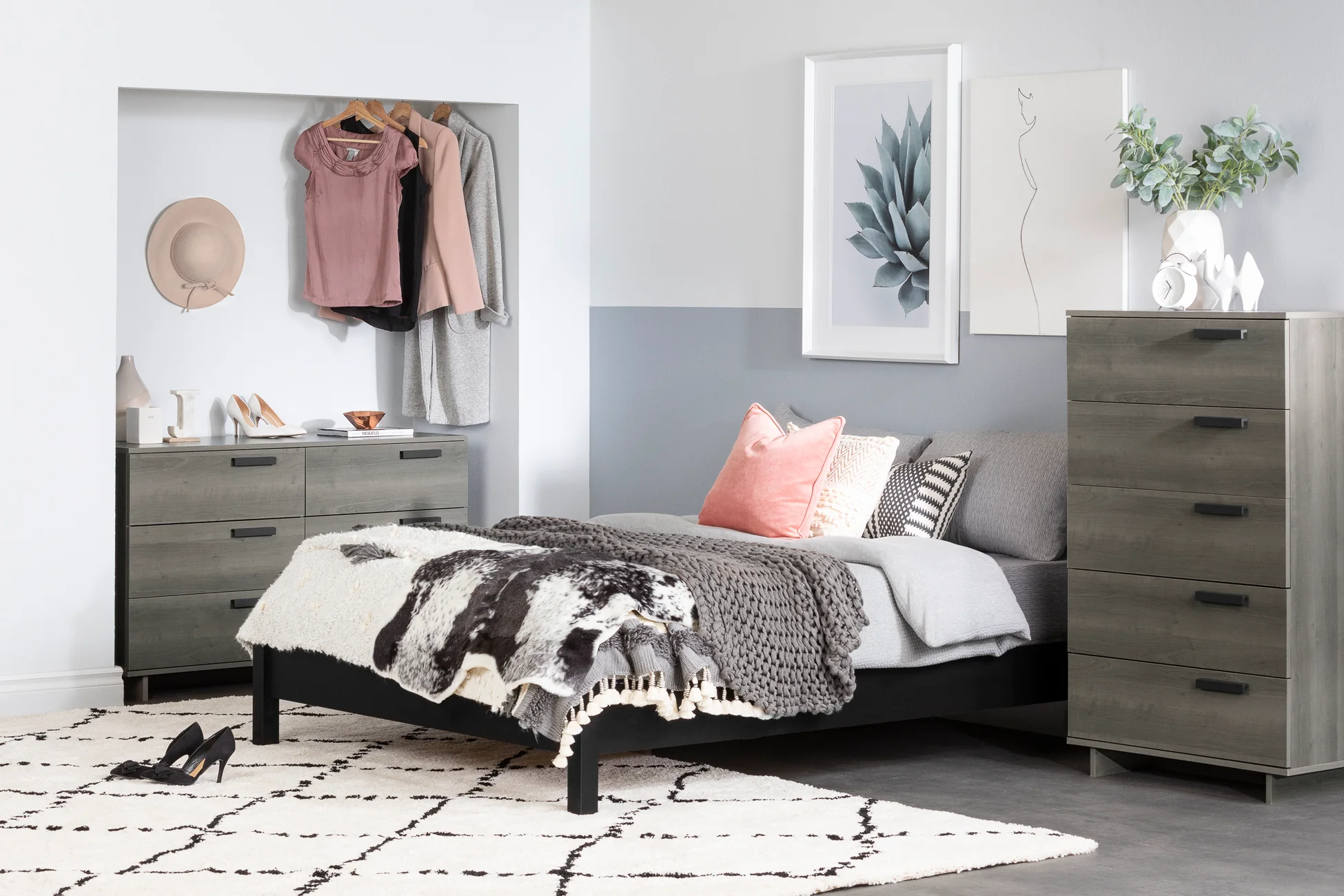 Avec ses poignées décentrées en métal et ses fines pattes qui donnent presque l’impression que le meuble flotte, cette commode sera un élément vedette dans votre chambre à coucher!