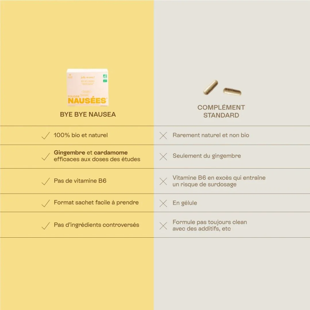 Bye Bye Nausea est un complément 100 % bio conçu pour soulager naturellement les nausées et vomissements liés à la grossesse. Une solution efficace et sûre pour aider les futures mamans à mieux vivre cette période.