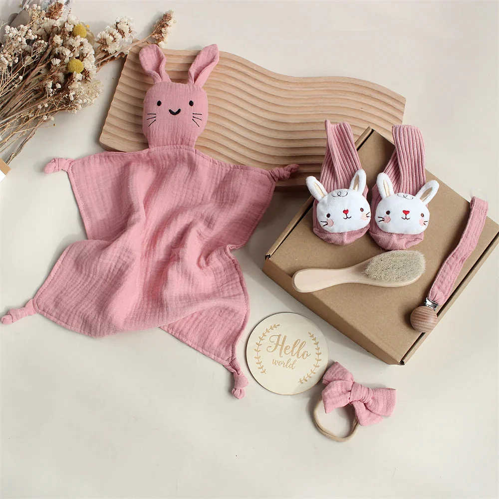 L’ensemble comprend Un doudou de couleur, Couverture, Bavoirs, Chaussettes, Bandeau de Sauna, Boîte Cadeau, Brosses à Hochet en Bois, Serviette de Lapin : 6 Pièces