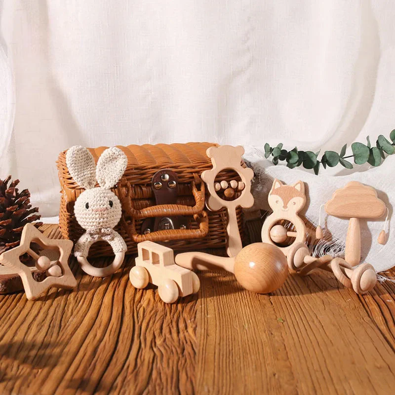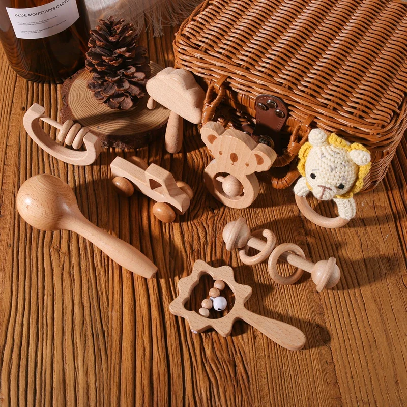 - Hochets en Bois Naturel : Des hochets en bois délicatement fabriqués, parfaits pour l’éveil sensoriel et le divertissement de bébé.
