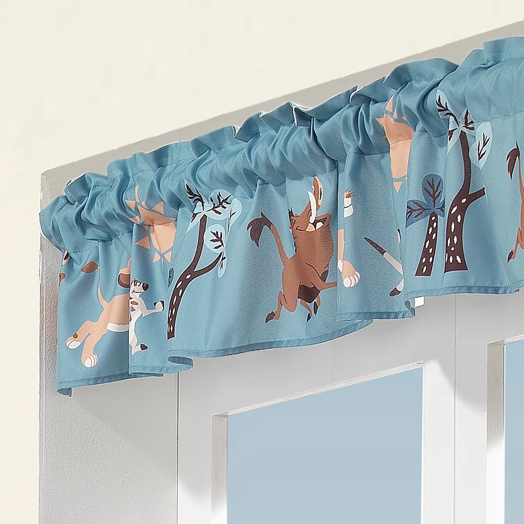 Une cantonnière de fenêtre coordonnée est un excellent moyen d’ajouter une touche design à la chambre de votre bébé. Simba, Pumbaa et Timon défilent sur la cantonnière bleue poussiéreuse parmi les arbres colorés et le soleil.