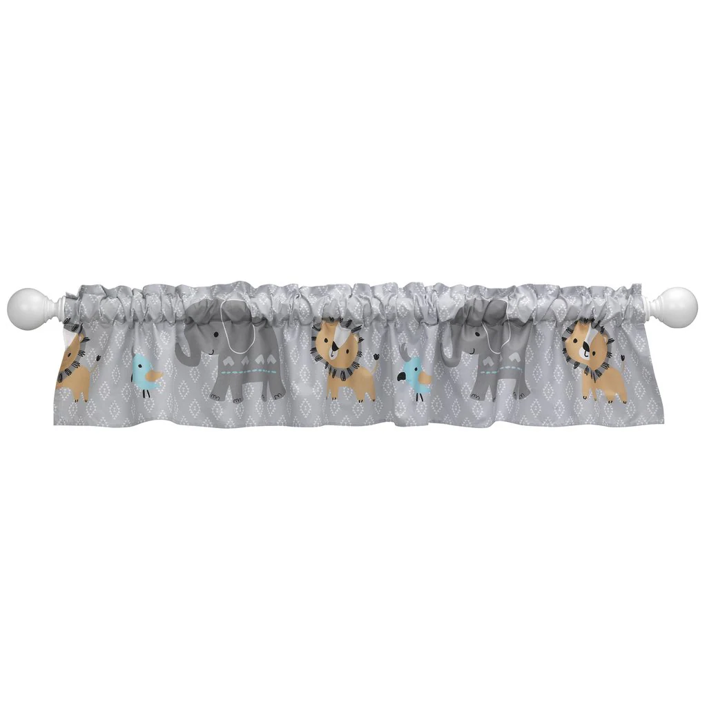 Des animaux de safari fantaisistes défilent sur cette cantonnière décorative. Le tissu de fond est un imprimé losanges gris et blanc. Mesure 54″ de long et 10″ de haut et est fait d’un mélange de coton et poly. Importé.