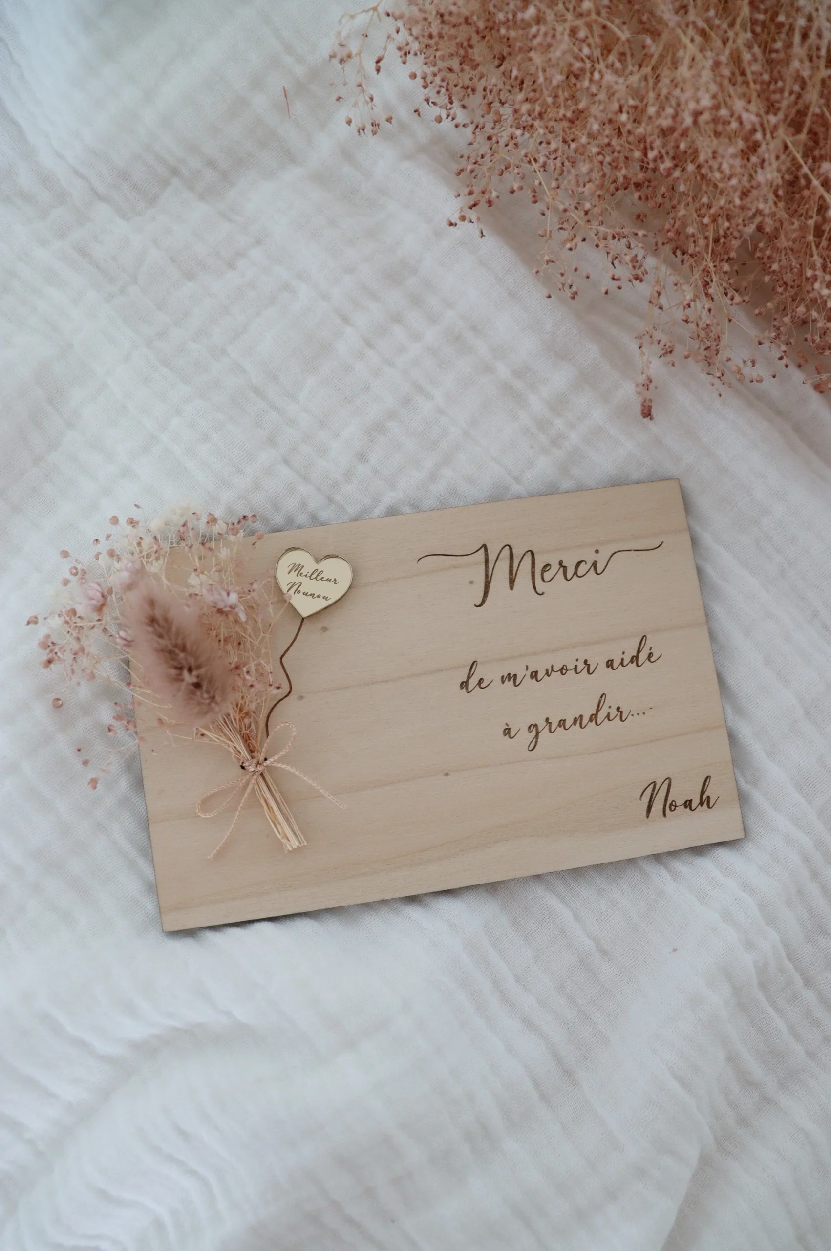 Carte de remerciements en bois accompagnée d’un bouquet de fleurs séchées parfumées.