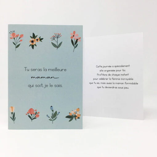 La carte de souhaits Meilleure Maman offre un design doux, aux couleurs modernes, en plus d’un message attachant et mignon pour accompagner nos ensembles cadeaux. Avec son message en français sur la couverture et à l’intérieur, l’option d’offrir la carte telle quelle avec une petite signature ou en ajoutant votre petite touche personnelle est à votre discrétion. De plus, la carte de souhaits Meilleur Maman s’ajoute super bien à l’un de nos Ensembles Cadeaux, pour offrir lors d’un party de dévoilement de sexe, d’un shower ou d’une naissance.
