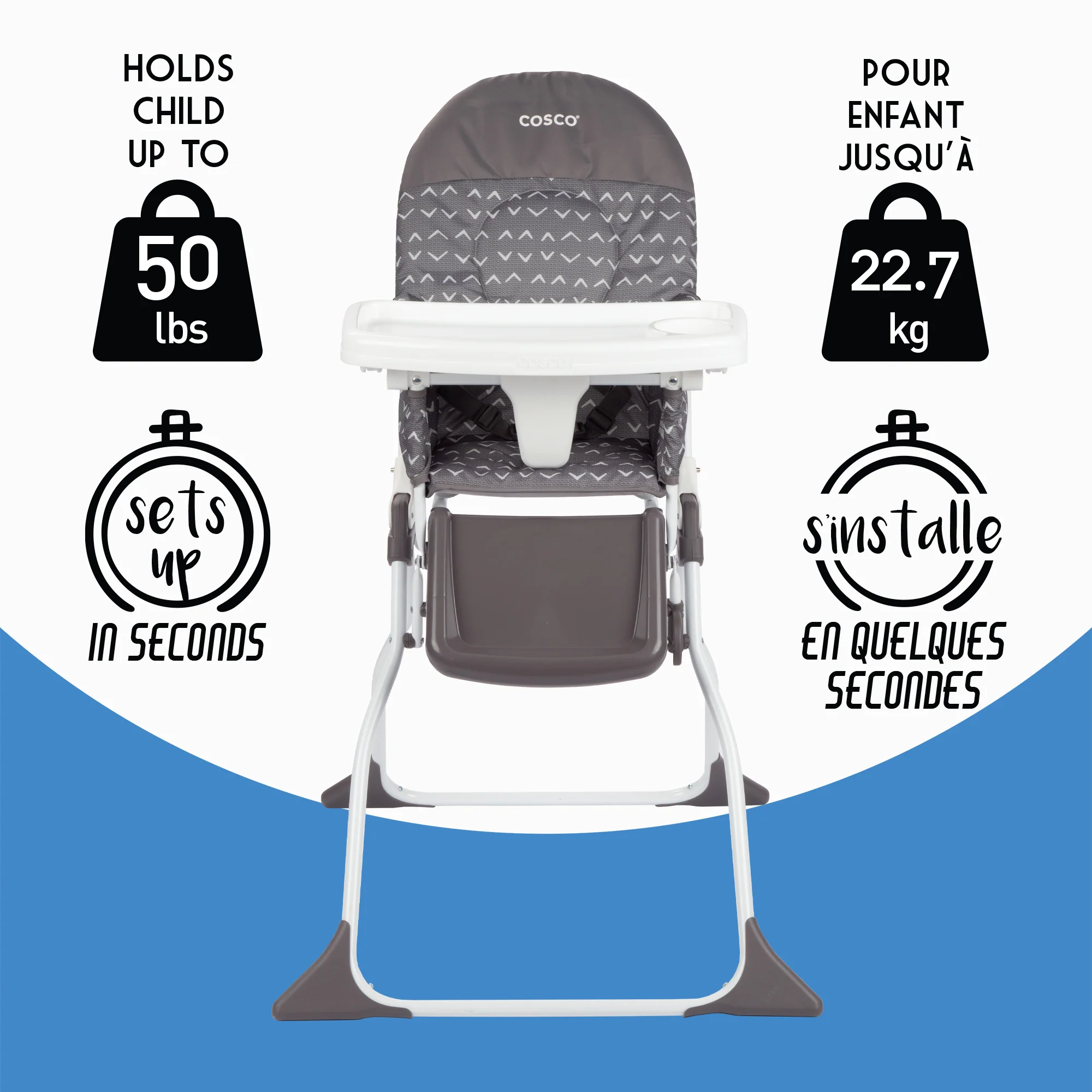 Invitez le plaisir aux repas avec la chaise haute Cosco Simple Fold™. Facile à ranger et à emporter, cette chaise haute est spécialement conçue pour être simple à emporter en balade. Le plateau réglable à 3 positions grandit avec votre enfant, lui donnant plus d’espace au fur et à mesure qu’il en a besoin. Le nettoyage est facile après des repas salissants grâce au coussin de siège lavable. La chaise haute se replie rapidement pour un rangement hors de vue ou pour se ranger facilement dans la voiture. Que vous dîniez à la maison ou à l’extérieur en voyage, la chaise haute Simple Fold offre à votre enfant un endroit amusant pour manger.
