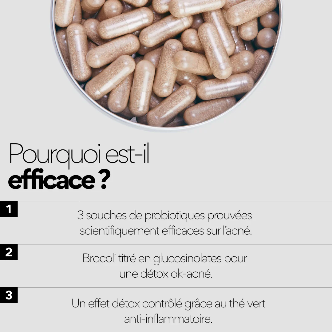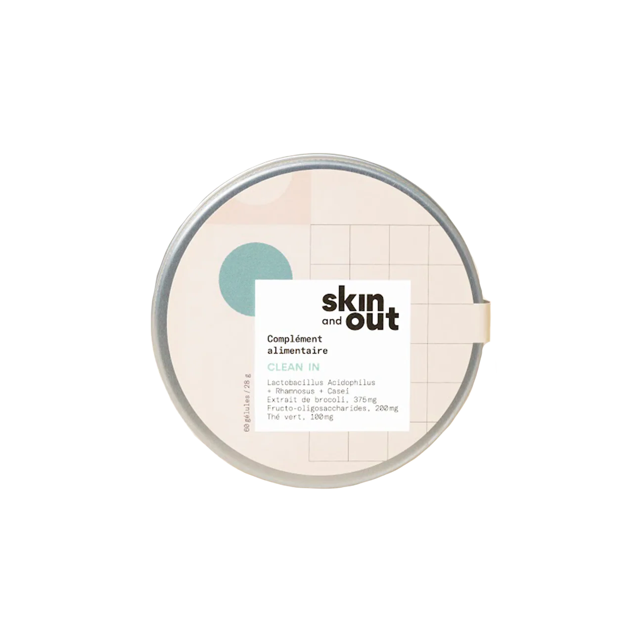 Le complément alimentaire Clean IN Skin & Out prépare votre peau à retrouver son équilibre en détoxifiant le foie et les intestins, organes essentiels à l’éclat cutané. Sa formule associe probiotiques et prébiotiques pour rétablir un microbiote sain, du brocoli pour activer les processus naturels de détoxification et du thé vert pour son action antioxydante et anti-inflammatoire.