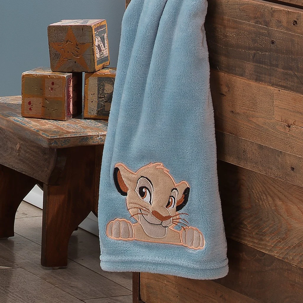 Simba dans une douce fourrure minky bicolore est centré au bas de la couverture, posant sa tête sur ses pattes avant. Cette couverture bleue douillette mesure 76,2 x 101,6 cm et est parfaite pour câliner votre tout-petit.