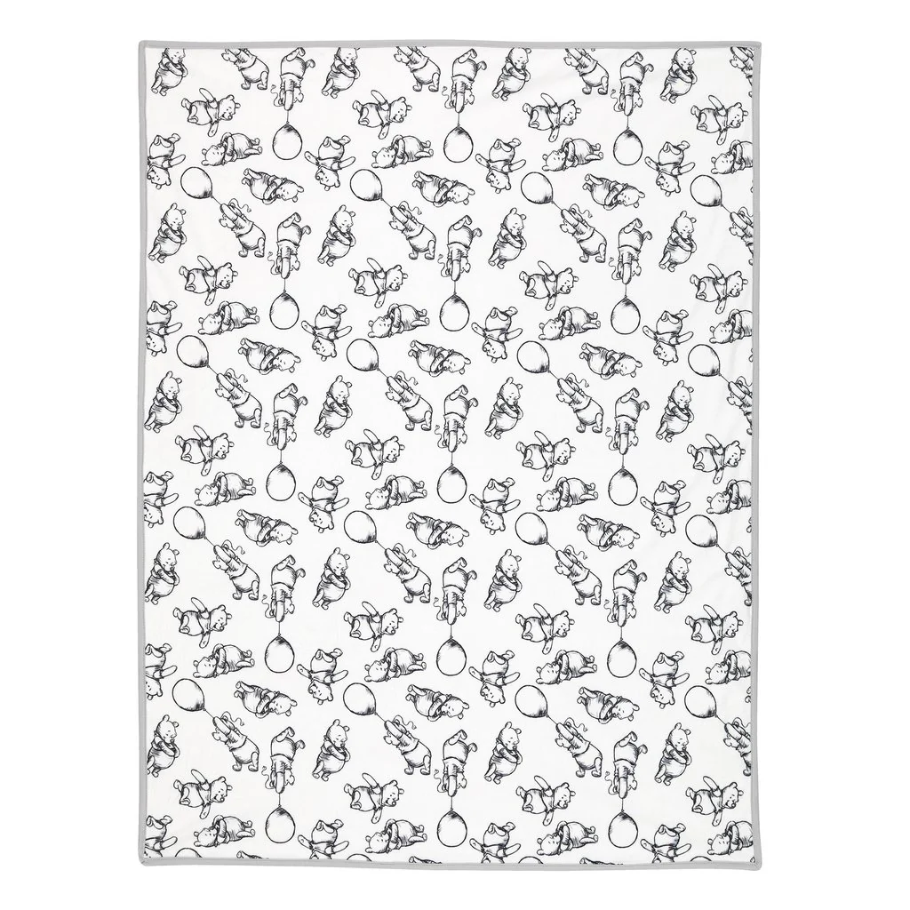 L’ours préféré de tous, Winnie l’ourson, décore cette couverture stylisée dans une couleur anthracite. Pooh est debout, marche en avant et tient son ballon préféré. Il est sur un fond de minky blanc et le dos de la couverture est un mélange de jersey de coton de couleur beige. Cette couverture amusante à emporter est lavable en machine pour un entretien facile. Il mesure 76,2 x 101,6 cm et est confortablement doux.