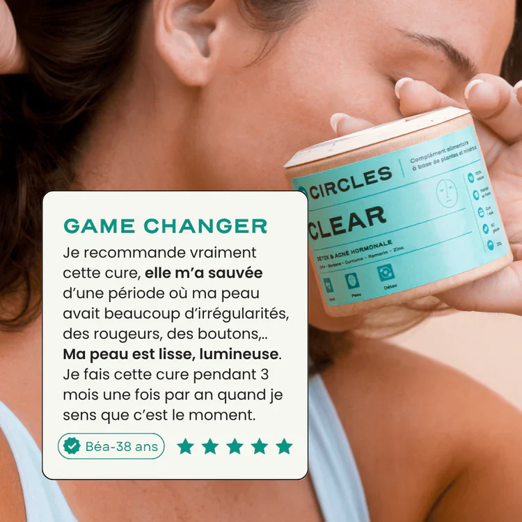 CLEAR est une cure détox anti-acné hormonale qui agit de l’intérieur pour soutenir le foie, réguler les déséquilibres hormonaux et réduire l’inflammation. Sa formule à base de plantes et minéraux aide à éliminer les toxines responsables de l’acné adulte.