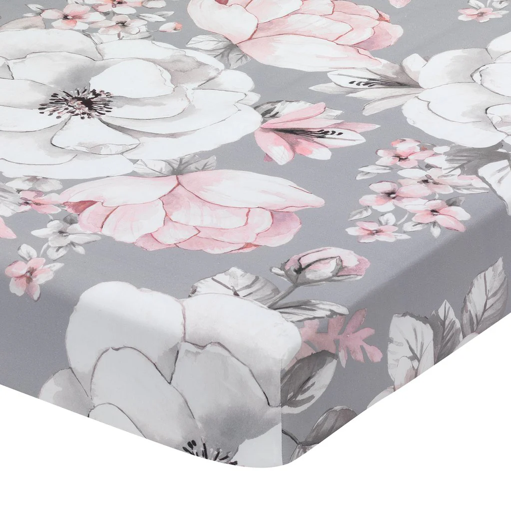 Ce drap-housse pour lit de bébé 100 % coton exquis a un fond gris avec des fleurs aquarelles roses et blanches en fleurs. Il est en coton respirant et a un élastique tout autour assurant un ajustement sûr et sécurisé sur un matelas de lit de taille standard mesurant 52 « X 28 ».