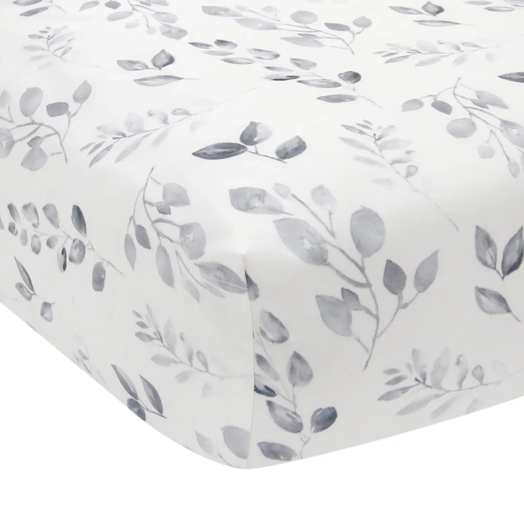 - Un joli motif de feuilles d’aquarelle dans des tons de gris décore le drap-housse 100 % coton.
