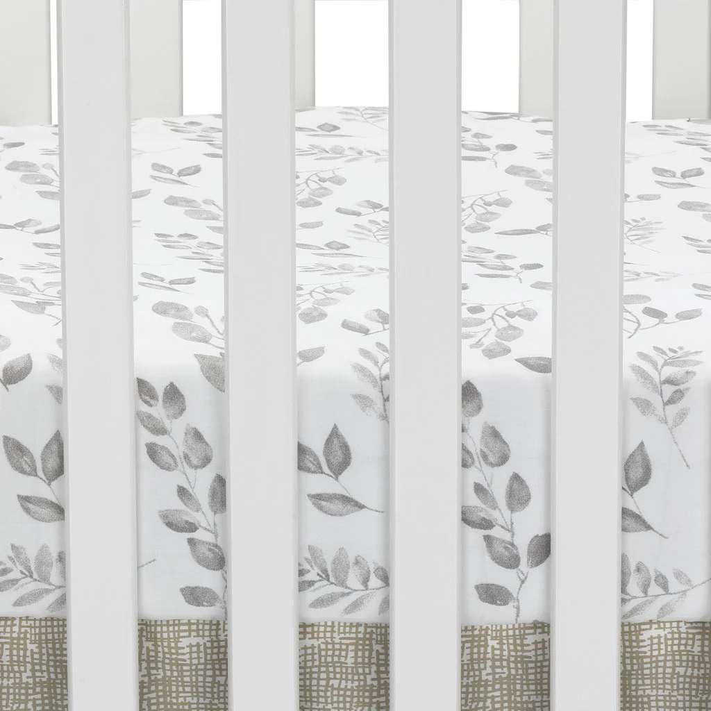 Un joli motif de feuille d’aquarelle dans des tons de gris décore le drap-housse 100 % coton pour lit de bébé. Le drap du berceau est entièrement élastique pour assurer un ajustement plus sûr. Convient à un matelas de berceau de 28 po x 52 po.