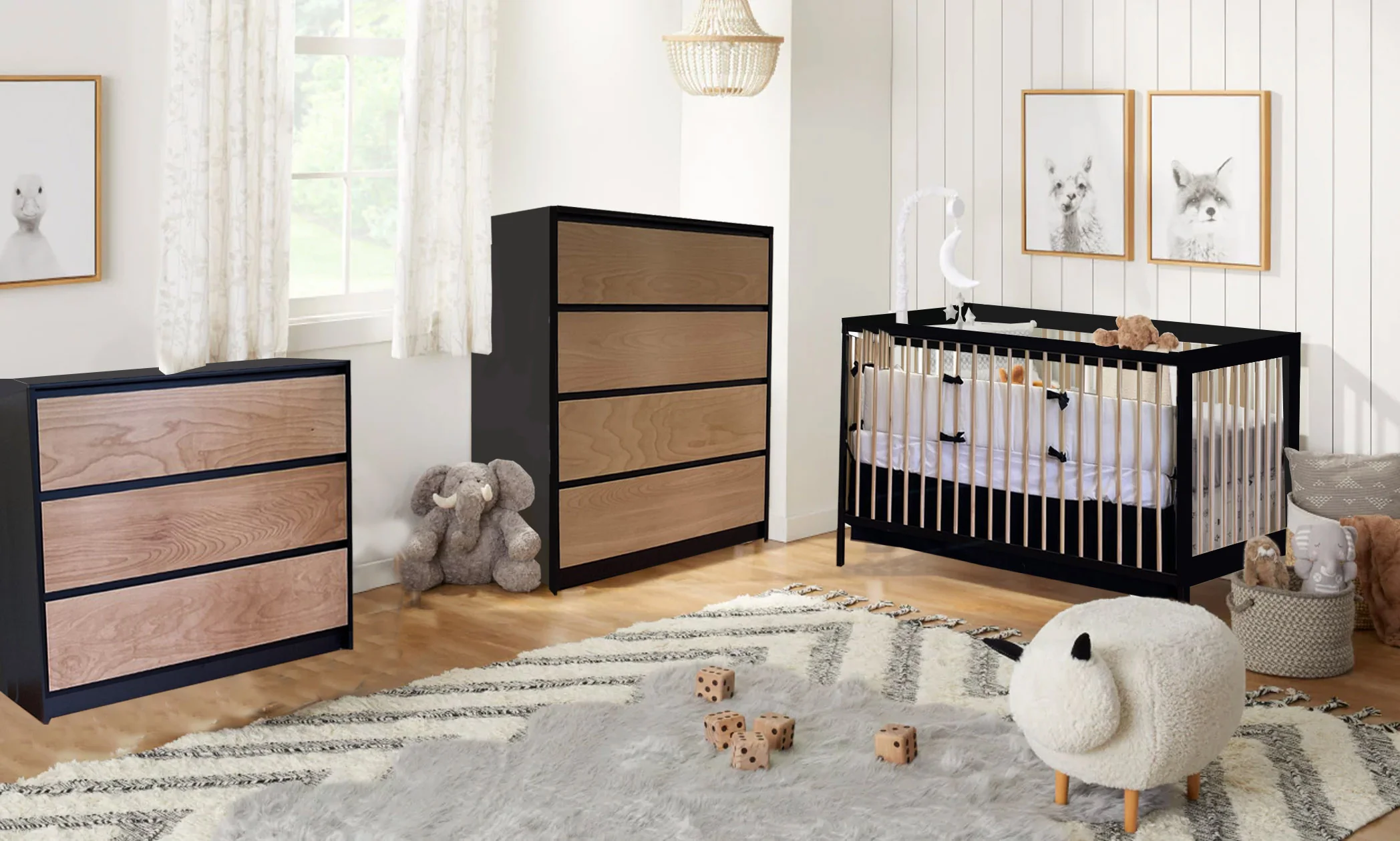 Harmonieux mariage entre le bois de merisier et la mélamine, cet ensemble de meubles apportera de la modernité à la chambre de bébé.