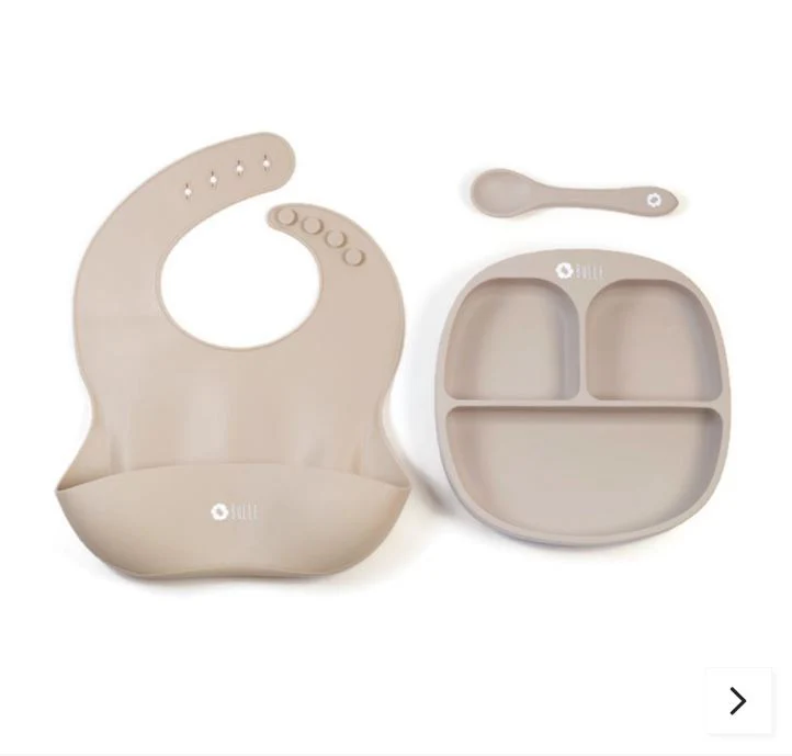 Cet ensemble 100% fait de silicone inclut : une assiette, une cuillère et une bavette.