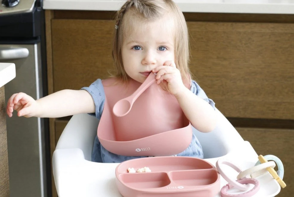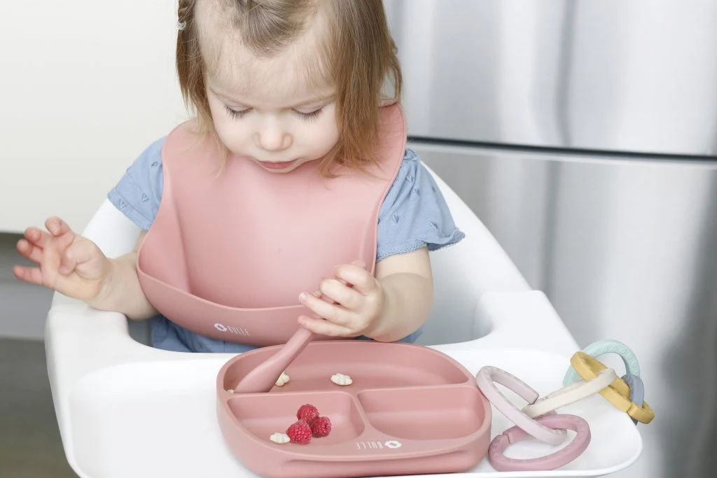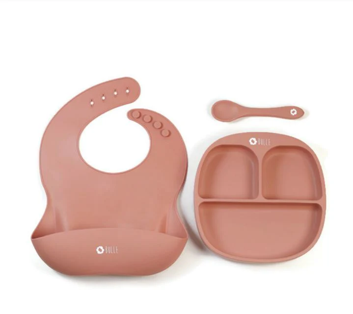 Cet ensemble 100% fait de silicone inclut : une assiette, une cuillère et une bavette.