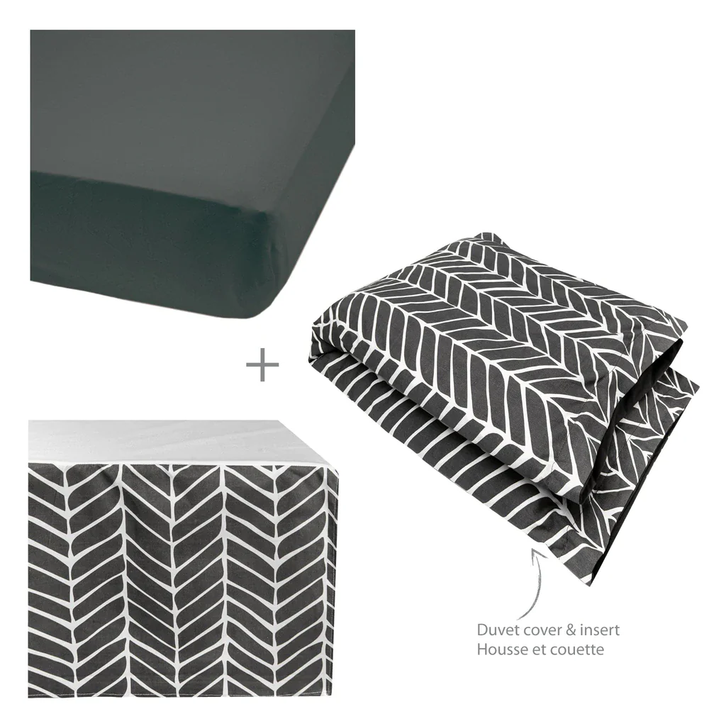 - Ensemble 4 morceaux comprenant une couette, une housse de couette, un drap contour et une jupe de lit.