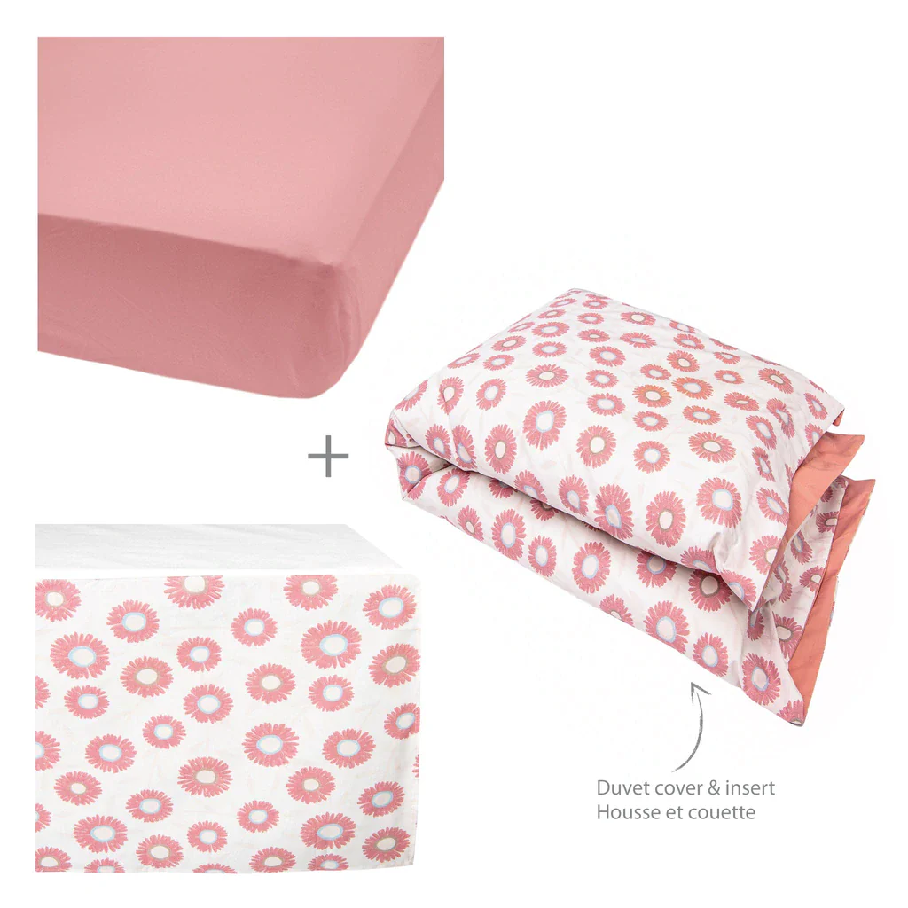 - L’ensemble comprend une couette, une housse de couette, un drap-housse et un cache-sommier