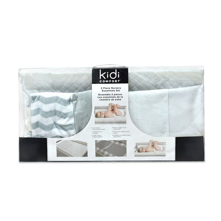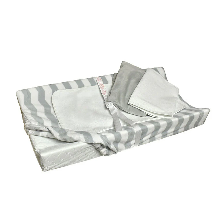 L’ensemble comprend : un matelas à langer, 2 housses de matelas à langer de luxe ( 1 uni, 1 imprimé chevron gris ) et 2 alèses de matelas à langer imperméables. – Rebords permettant une plus grande sécurité pour bébé