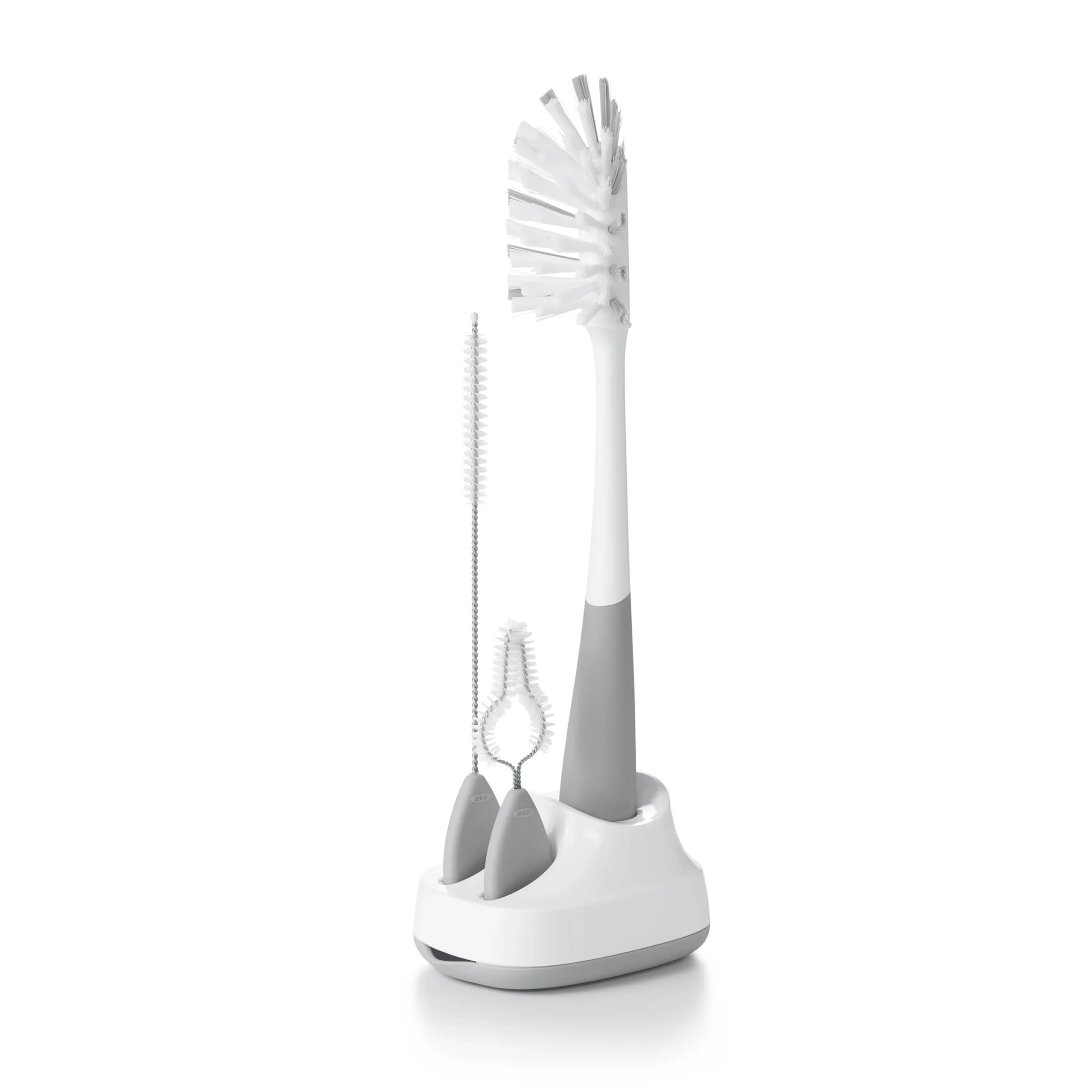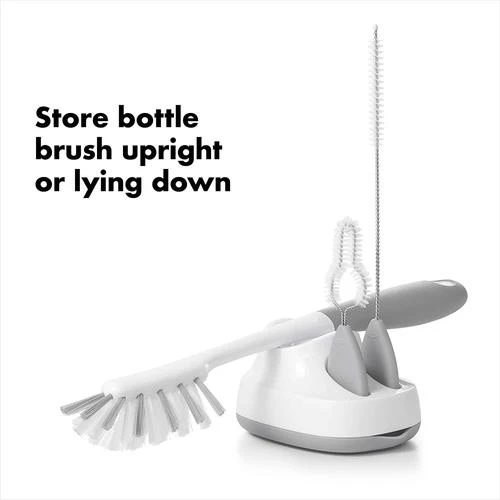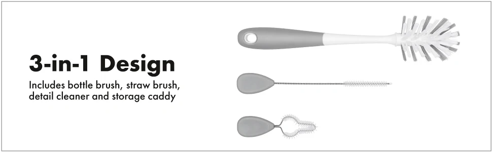 Le long goupillon nettoie facilement les bouteilles à col étroit ; Les poils spécialement conçus minimisent les projections d’eau pendant le nettoyage. La brosse à paille nettoie en profondeur tout type de paille ; la brosse de détail pénètre dans les crevasses et les petits espaces dans les couvercles .Les poils sont durables pour un récurage sérieux et anti-rayures pour protéger les biberons, et les poignées douces et antidérapantes offrent une prise ferme, même lorsqu’elles sont mouillées. Brosse compacte Caddy stocke la brosse dans deux positions : au-dessus de l’évier et vers le haut et à l’abri des germes.