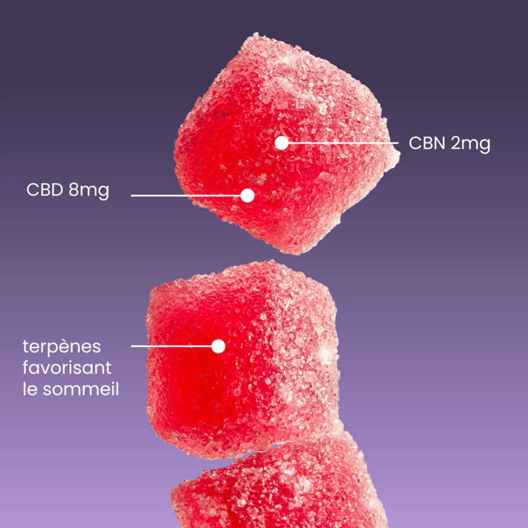 Ces gummies sans THC, vegan et au goût fruité, vous accompagnent dans une routine bien-être pour un sommeil profond, serein et 100 % naturel.
