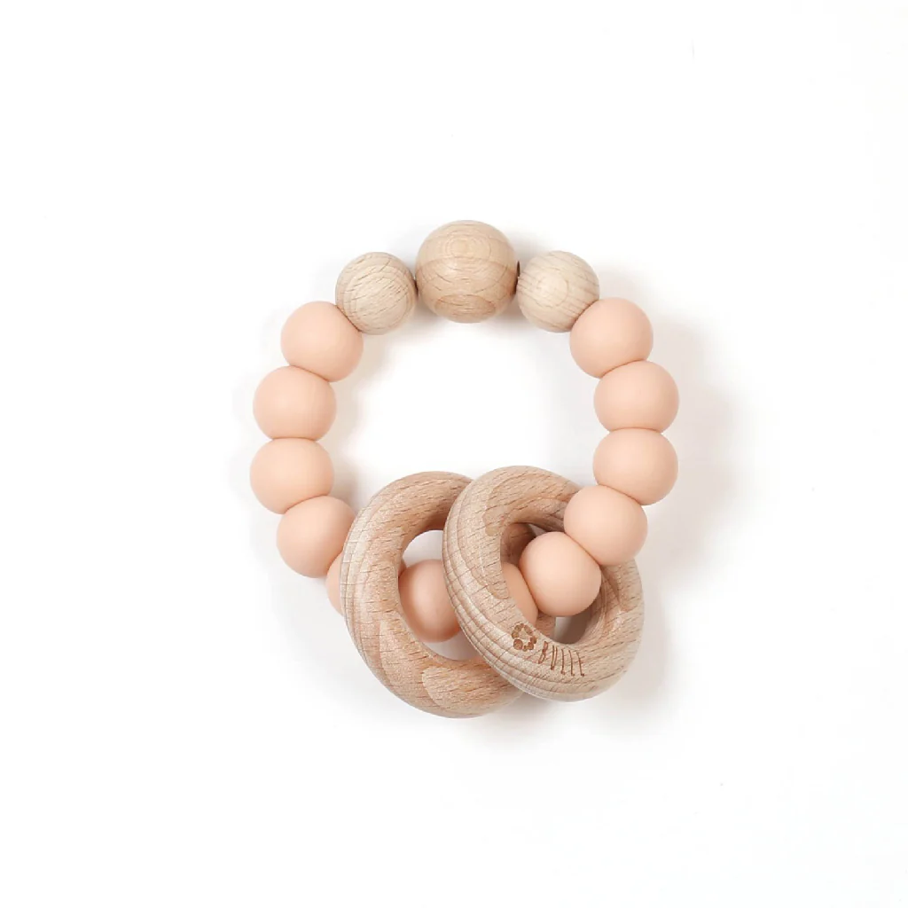 Bébé appréciera le mélange des textures du bois et du silicone qui éveilleront ses sens, l’aideront à soulager la douleur associée à la poussée dentaire ainsi qu’à développer sa motricité fine. Sans oublier les jolis cliquetis émis par le bois qui s’entrechoque lorsque bébé secoue son hochet: divertissement garanti!