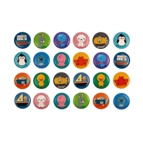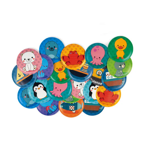 Jeu de mémo rigolo pour jouer dans le bain ! 24 cartes en mousse qui flottent et qui tiennent sur la faïence une fois mouillées.