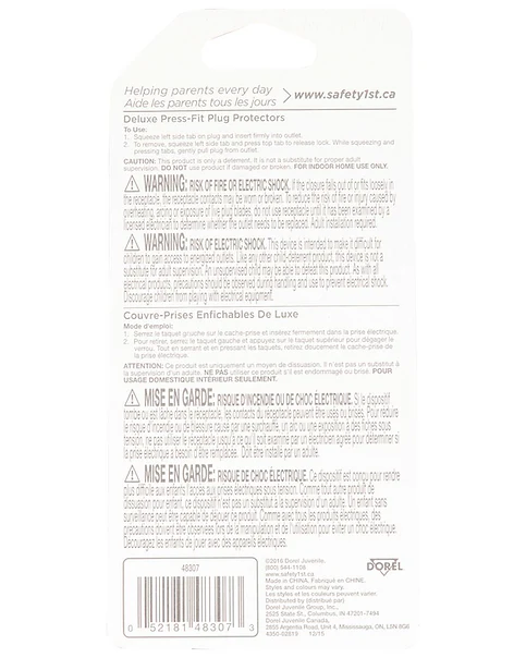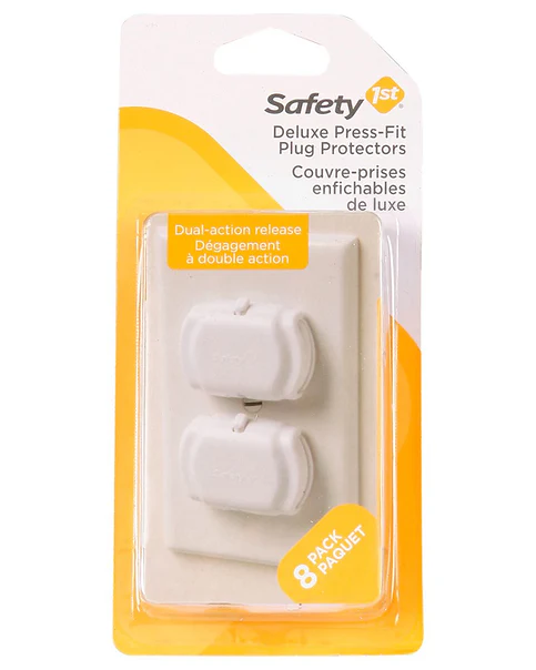 Le protecteur de prise Safety 1st Deluxe Press Fit a une conception unique qui rend ces prises extrêmement difficiles à défaire pour les enfants tout en étant faciles à utiliser pour les parents. Aide à protéger les enfants des chocs électriques. Le Plug Protector est livré avec une fonction Press ‘n Lock à deux touches, est facile à installer et durable même avec une utilisation répétée.