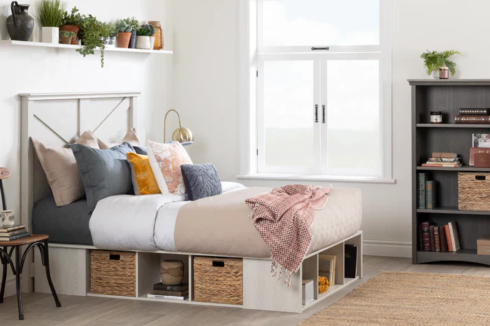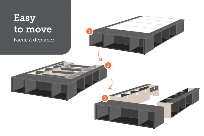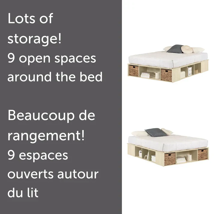 Ce lit avec plusieurs espaces de rangement est inusité et ingénieux! Il offre plusieurs casiers ouverts sur 3 côtés du lit. L’espace sous le lit estvaste: vous pouvez y serrer des livres, draps et accessoires.