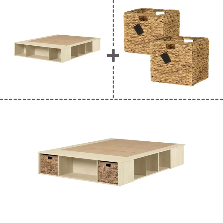 Lit Double avec paniers de rangement en osier inclus Avilla – Chêne blanchi