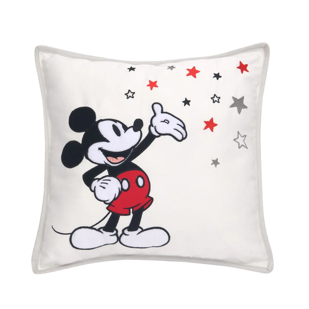 Célébrez Mickey Mouse avec ce charmant coussin décoratif en coton pour chambre de bébé. Un Mickey appliqué de 8 ½ po se dresse sur le côté gauche, admirant une poignée d’étoiles brodées. Le dos de l’oreiller et de la reliure est un tissu sergé gris avec des étoiles blanches. Il y a une ouverture à l’arrière pour un accès facile au coussin rempli de poly. L’oreiller mesure 13 « X 13 » et a un rembourrage en polyester.