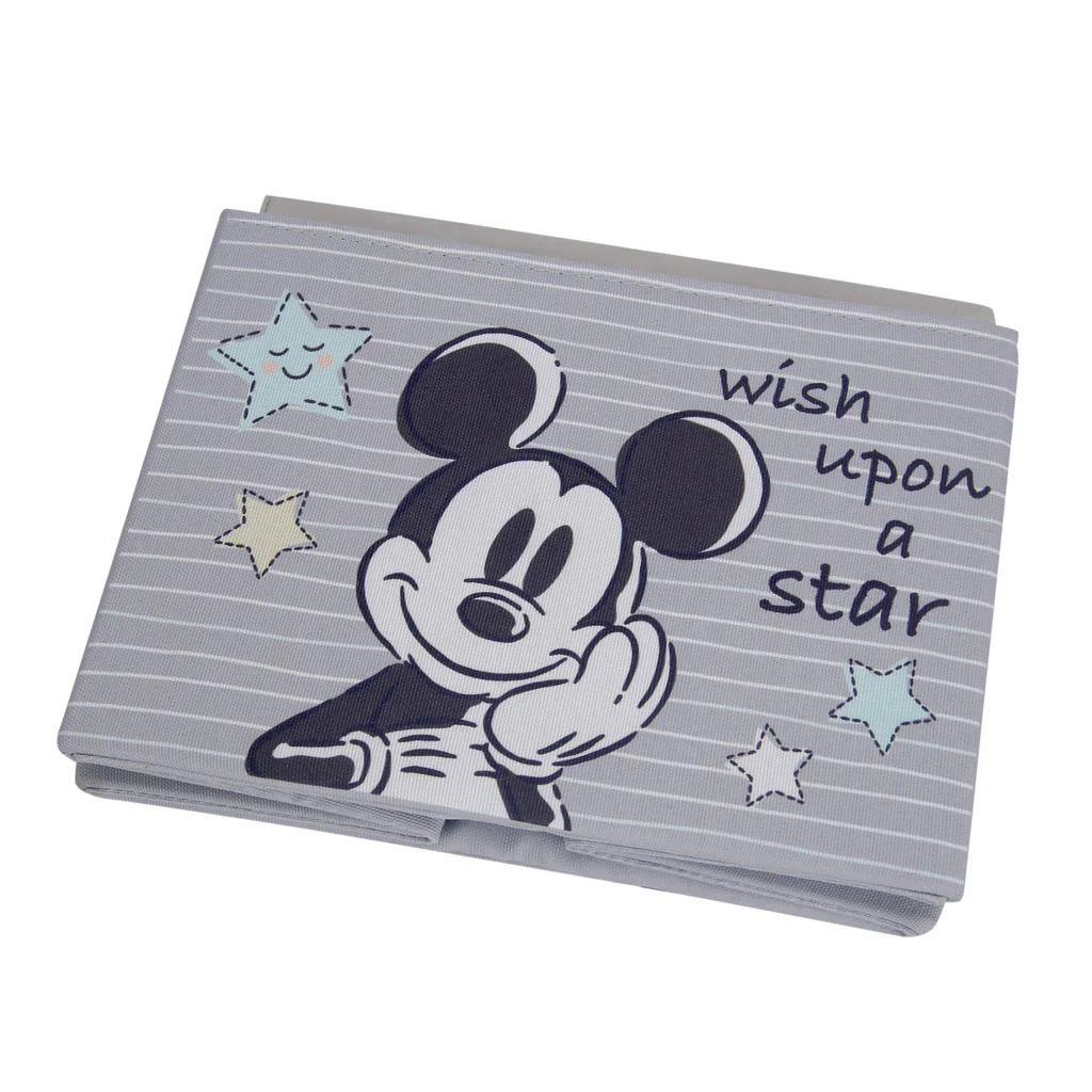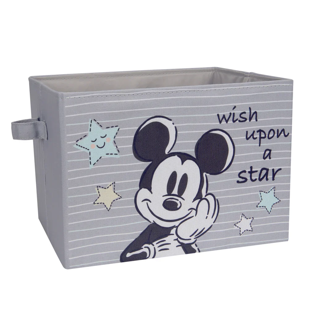 Mickey Mouse est la mascotte de longue date de The Walt Disney Company. Ce rangement pliable Mickey Mouse sous licence officielle est robuste et durable. Il représente Mickey sur un fond gris avec des lignes blanches et bleues. Il mesure 7 1/4 pouces et est dessiné dans un style sommaire gris foncé et blanc. Les mots « vœu sur une étoile » sont imprimés avec quatre étoiles bleues, blanches et jaune crème. Il y a deux poignées latérales pour un transport facile. Le contenant de stockage mesure 12½ x 11 x 9 pouces.