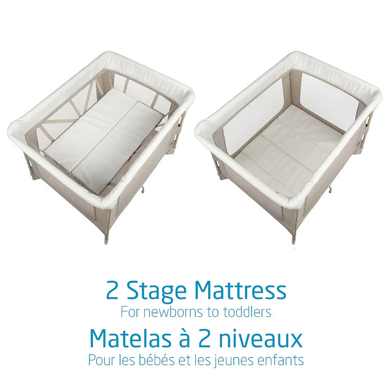 Le Swift est doté d’un matelas unique à 2 niveaux qui se dézippe pour s’adapter parfaitement à la nacelle. Le parc offre ainsi un matelas plus petit et plus confortable, idéal pour les nouveau-nés. Au fur et à mesure que votre bébé grandit, le matelas se referme pour créer un espace plus grand et super confortable pour la récréation ou une sieste bien méritée.