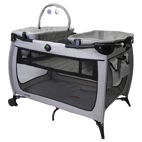 La bassinette pour nourrisson comprend une barre à jouets et des jouets en peluche qui attirent l’attention de bébé lorsqu’il est réveillé. Le support à langer est facile à nettoyer et dispose d’une fonction de pince et de retour qui permet un rangement facile lorsqu’il n’est pas utilisé. Les pochettes de rangement sont pratiques pour les canapés supplémentaires, les lingettes et les essentiels de bébé. Le parc Safe Stages se plie rapidement pour un transport facile dans le sac de voyage.