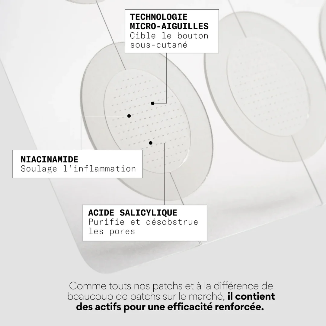 Les Patchs micro-aiguilles Skin & Out diffusent des actifs purifiants directement sous la peau pour cibler les boutons profonds dès leur formation. Grâce à la technologie micro-aiguilles, à l’acide salicylique et à la niacinamide, ils désobstruent, apaisent et réduisent l’inflammation sans douleur.