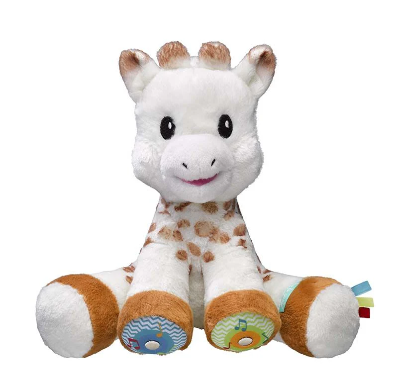 La peluche Touch & Music est désormais musicale et lumineuse ! Cette peluche magique est parfaite pour des moments de partage et de complicité entre parents et bébé ! Il suffit de toucher simultanément les deux capteurs sensoriels sur les pattes de Sophie avec la peau pour activer une note de musique et voir l’étoile s’illuminer !