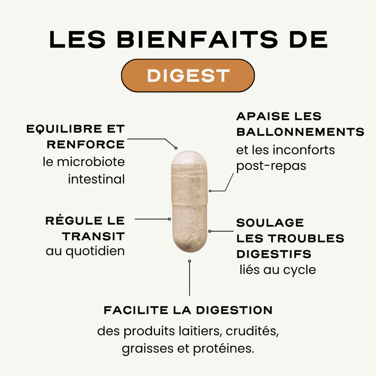 DIGEST est une cure de probiotiques pour l’équilibre de la flore intestinale, spécialement formulée pour accompagner les troubles digestifs fréquents chez la femme. Sa combinaison de probiotiques, enzymes digestives et plantes comme le carvi noir aide à réduire ballonnements, constipation, diarrhées, reflux et inconforts digestifs.