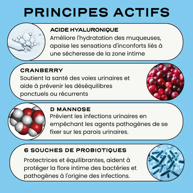 Elle renforce le microbiote intime, soutient la santé des muqueuses et améliore le confort intime au quotidien, notamment en période de fragilité (stress, antibiotiques, cycle).