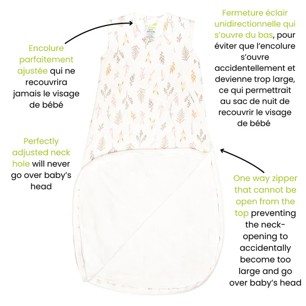Les gigoteuses Perlimpinpin sont parfaitement ajustées pour s’adapter au contour du cou et ne s’ouvrent que par le bas afin de s’assurer que le sac ne soit jamais par-dessus la tête de bébé.