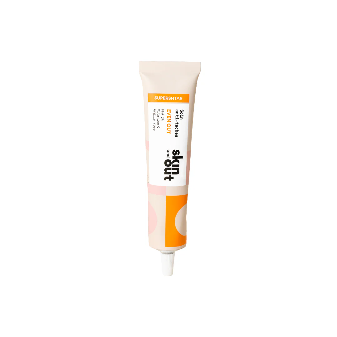 Le Soin Even OUT Skin & Out agit sur les taches rouges et brunes post-boutons pour révéler un teint plus uniforme. Sa formule associe vitamine C, PHA (5%) et argile rose pour exfolier en douceur, apaiser et corriger les irrégularités pigmentaires.