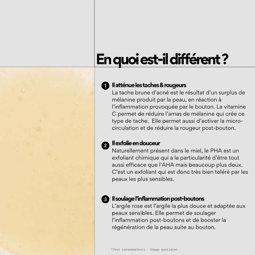 Résultat : la peau retrouve son éclat naturel, les marques s’estompent et le grain de peau s’affine sans irritation. Idéal après un épisode d’acné ou en soin local sur les zones marquées.