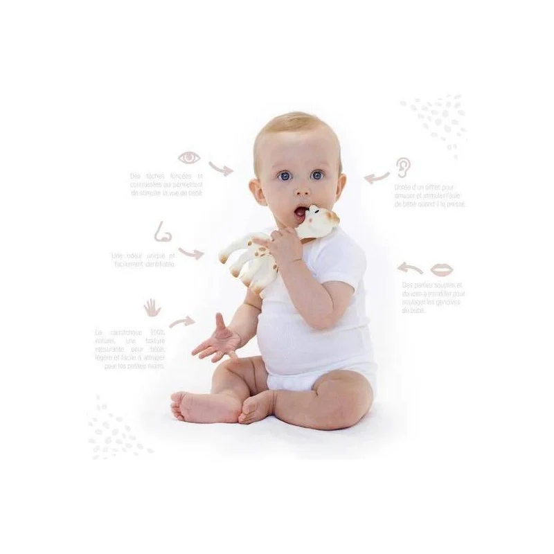- LE GOÛT : Souple et dotée de nombreuses parties à mordiller (oreilles, cornes, pattes), elle est idéale pour soulager les gencives de bébé lors des poussées dentaires. Composée de caoutchouc 100% naturel et de peinture apte au contact alimentaire, elle est sans danger pour bébé.