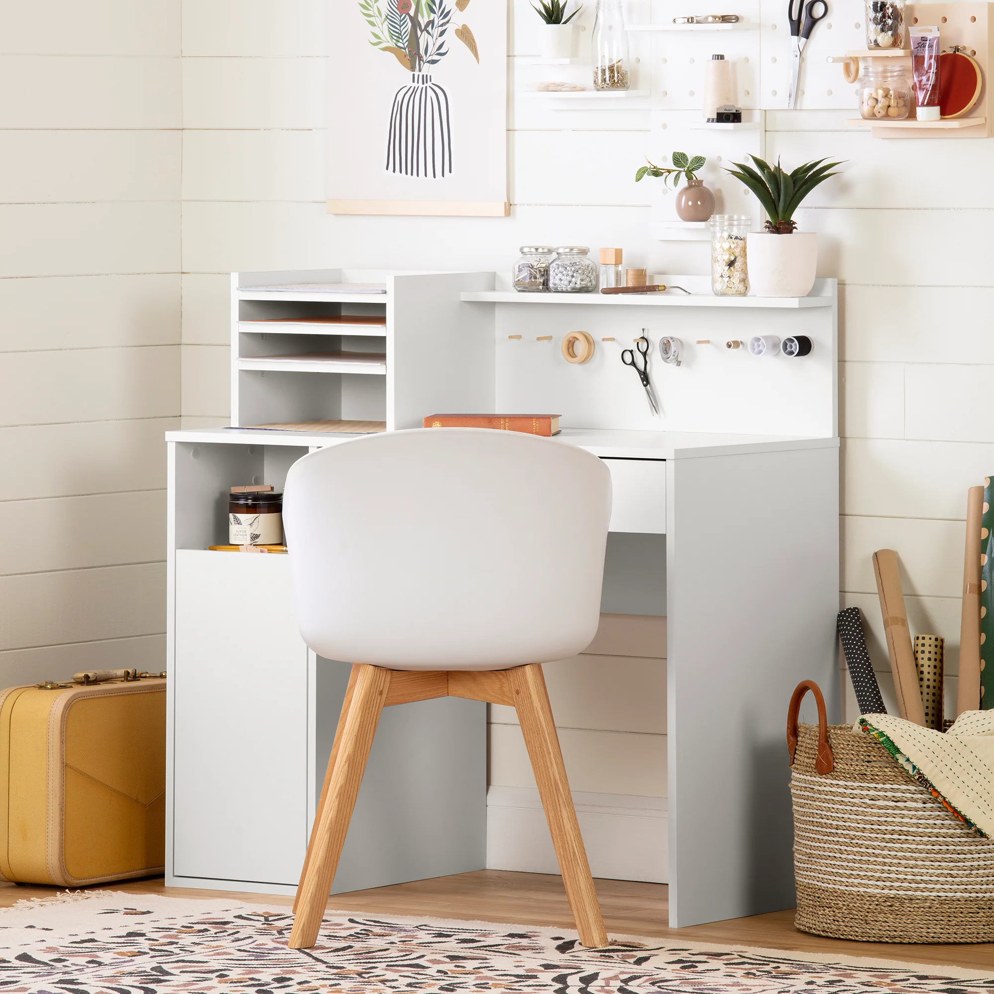 Fan de DIY? Cette table est faite pour vous! Elle possède 10 tiges en bois qui vous permettent d’accrocher tous vos essentiels brico: rubans, ciseaux, fils, bobines etc. La tablette au haut du meuble est aussi à votre disposition pour organiser vos outils et vos accessoires. Truc déco : placez-les dans des pots mason, pour une petite touche vintage