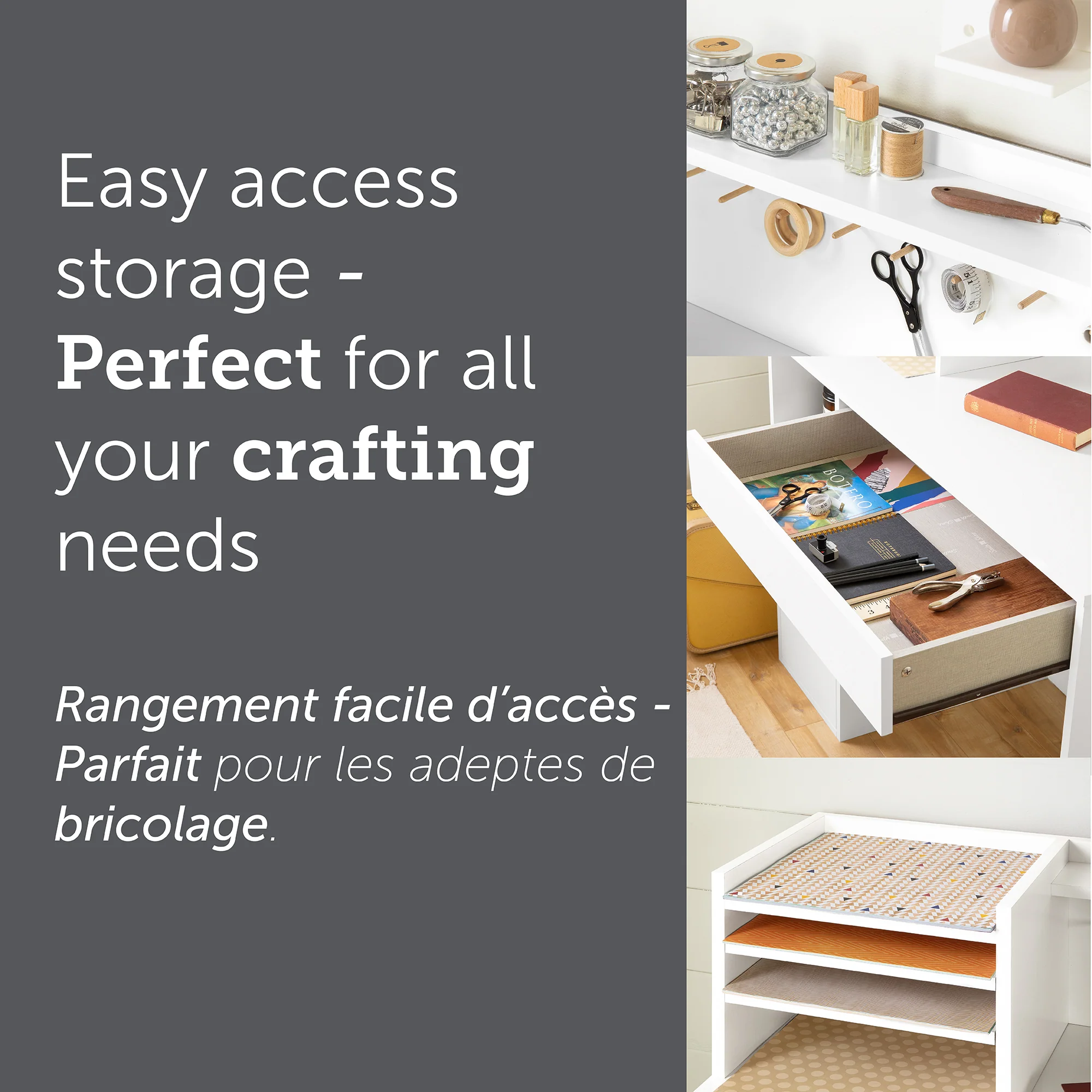 À la gauche du meuble, des tablettes style classeur ont été spécialement dessinées pour contenir des papiers carrés de scrapbooking. Vos feuilles pourront donc être parfaitement classées, sans qu’elles ne dépassent du meuble. Avec cette table, vous êtes maintenant chez les pros!