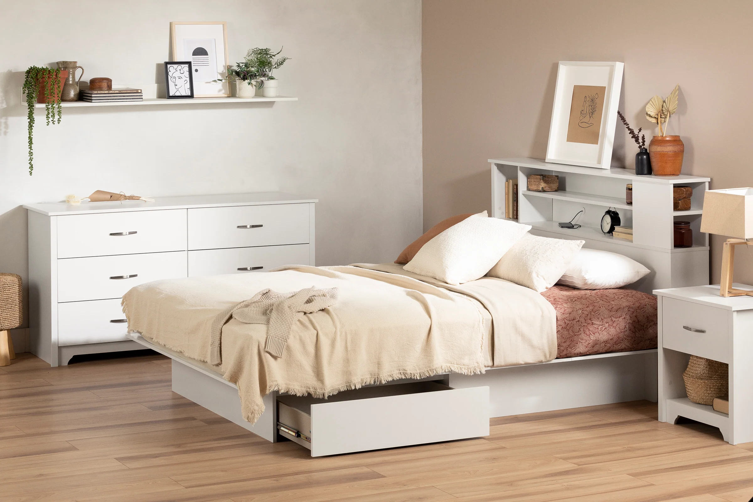 POUR UNE CHAMBRE PRATIQUE : cette table de chevet est dotée d’un tiroir profond et d’un espace de rangement ouvert facilement accessible, ce qui la rend idéale pour garder certains objets personnels comme des livres et des lunettes à portée de main dans la chambre .